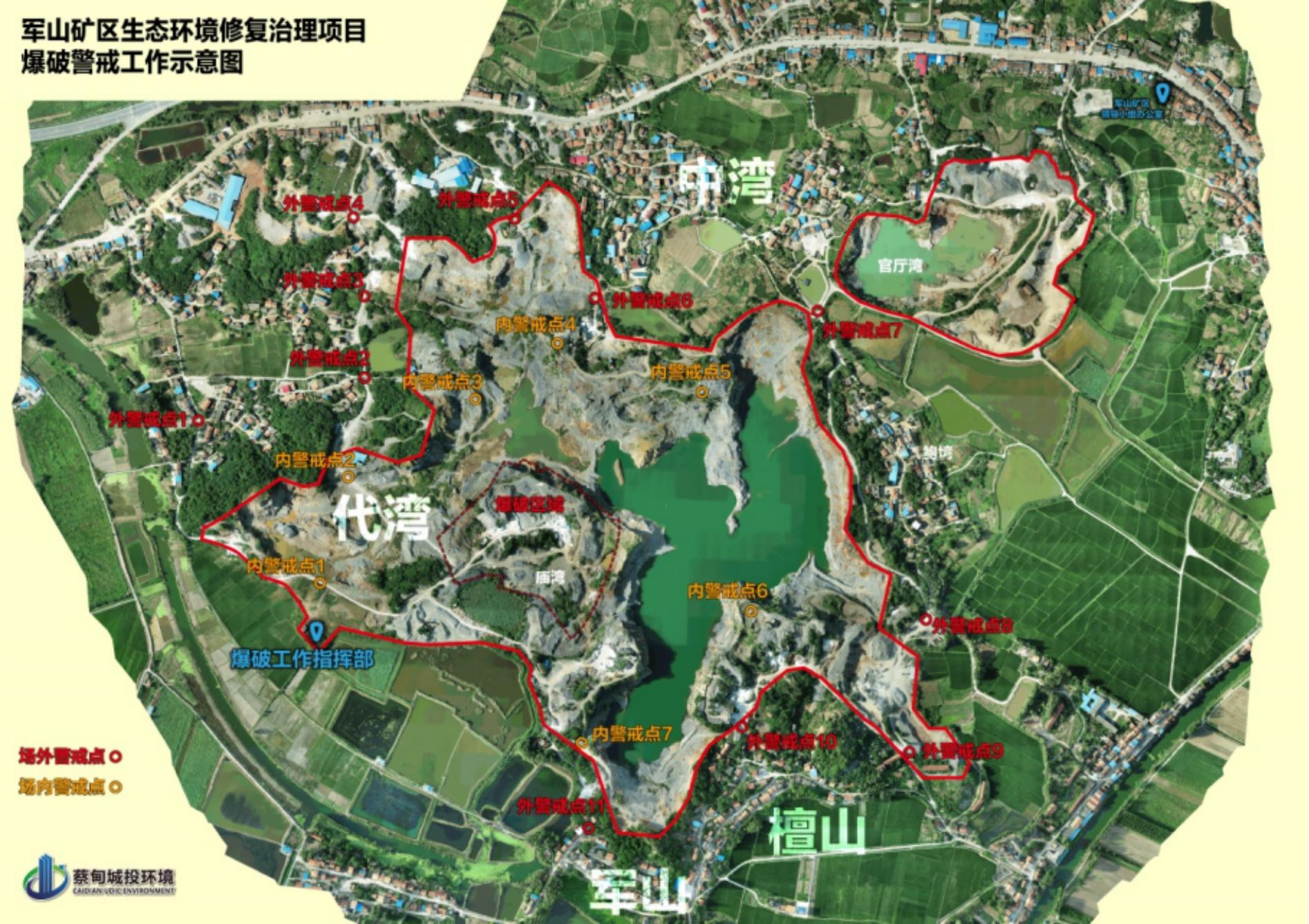 針對該爆破工程,相關部門組織成立了軍山礦區(qū)生態(tài)環(huán)境修復治理項目爆破工作指揮部,由區(qū)自然資源和城鄉(xiāng)建設局副局長任總指揮,湖北地建集團領導任爆破現場指揮,成員單位為區(qū)公安分局、區(qū)應急管理局、侏儒山街道辦事處、區(qū)城投集團、侏儒山街派出所、侏儒山街綜合執(zhí)法中心、侏儒山街衛(wèi)生院、“三村一社區(qū)”村委(代灣村委會、中灣村委會、軍山村委會、檀山社區(qū)居委會)、湖北地建集團、池州長江巖土爆破有限公司。下設10個工作專班,負責安全保障、應急處置等工作。